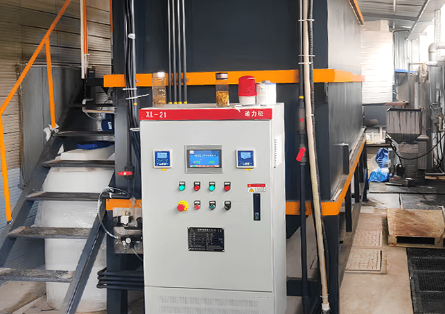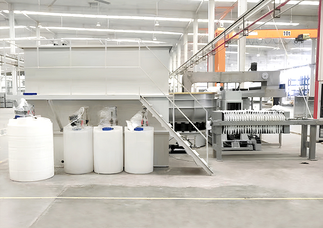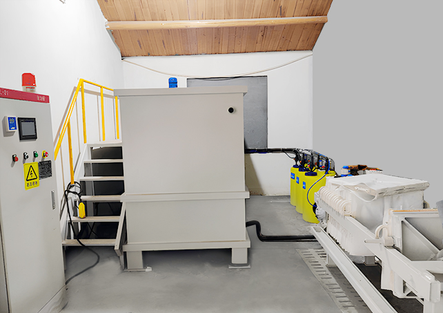 该设备利用碳钢防腐水箱,设备得电后,浮球控制设备启停,设备上安装在线PH计,自动调整PH,设计自动加药系统,水经调节后,进入混凝池,开始搅拌并自动加药混凝,后进入絮凝池进行搅拌并自动加药絮凝,水自流至斜板沉淀池,沉淀池内安装斜管填料,将污泥沉淀于设备储泥斜斗内,定期抽至压滤机进行固液分离,上清液流入清水池后达标排放。