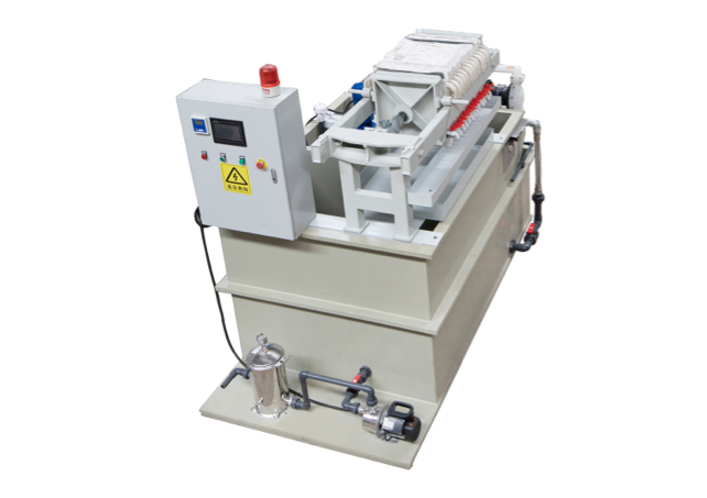 一体式小型废水处理设备,该设备占地面积小,自动化程度高,可在客户方集水池安装液位浮球,实现客户水池液位高时,水处理系统自动启动,开始打水至系统进行处理,液位低时,自动停机。系统设置有在线PH计,对废水PH进行自行调节,水调节后混凝、絮凝后,经过压滤,压滤出水进入清水池,后再经砂碳过滤器、精密过滤后达标排放或回用于生产。系统由PLC自动控制,自动加药,自动调节PH等,操作简单,整机采用PP板焊接制造,外观美观、防腐性高。